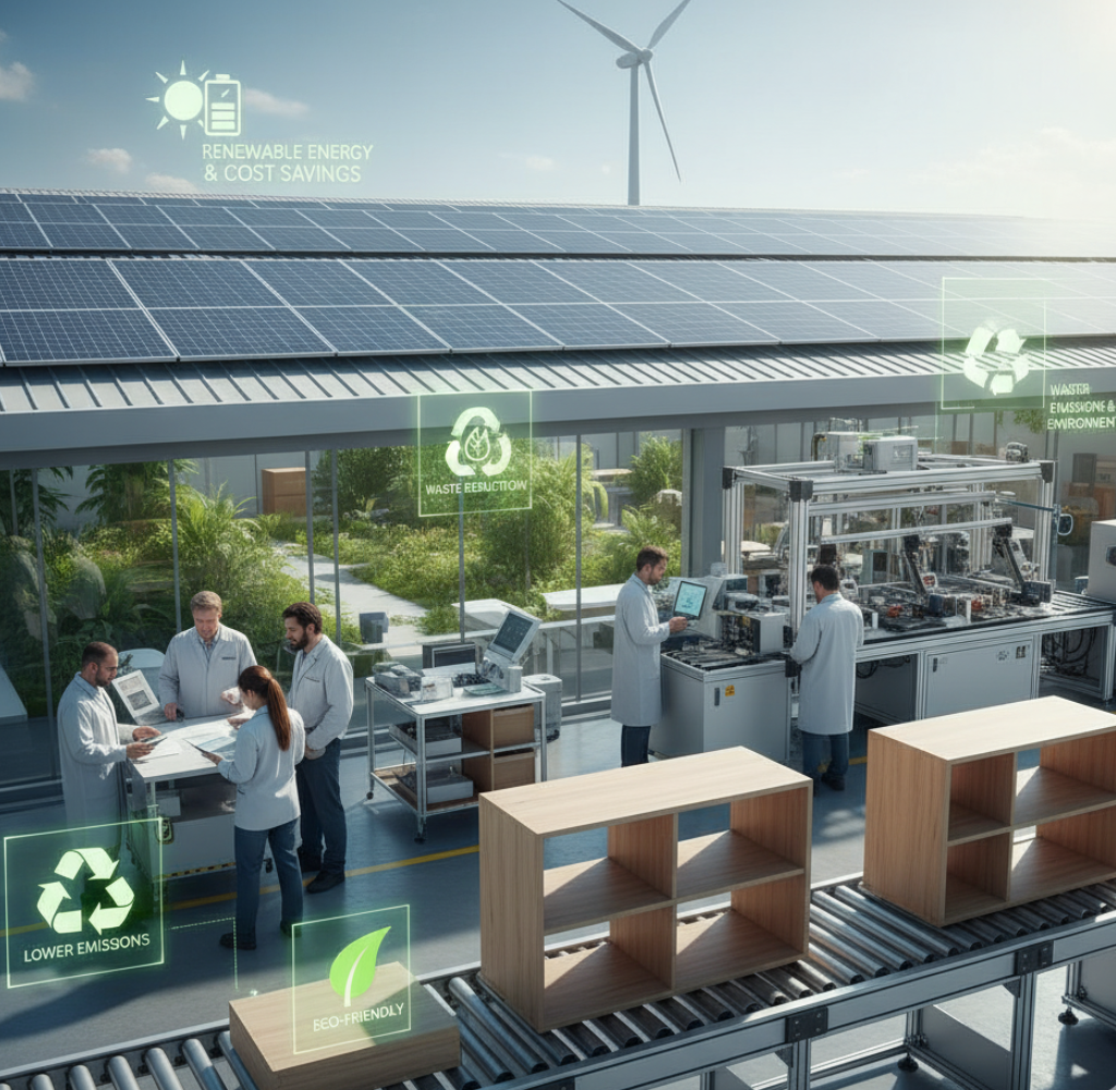 Furniture and fittings manufactured using solar-powered processes, recyclable materials, and zero-waste systems.